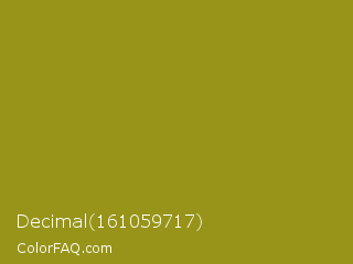 Decimal 161059717 Color is a normal yellow color and the nearest color is Dark Yellow #9b870c. Hex code #989419 and RGB value is rgb(152,148,25). In RGB color space, this color is composed of 60% red, 58% green, 10% blue, In CMYK color space, this color is composed of 0% cyan, 3% magenta, 84% yellow , 40% black , In HSL color space, this color has a hue angle of 58° , 72% saturation and 35% lightness.
