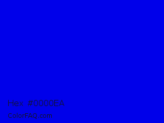 Hex #0000ea Color is a normal blue color and the nearest color is Blue #0000ff. Hex code #0000ea and RGB value is rgb(0,0,234). In RGB color space, this color is composed of 0% red, 0% green, 92% blue, In CMYK color space, this color is composed of 100% cyan, 100% magenta, 0% yellow , 8% black , In HSL color space, this color has a hue angle of 240° , 100% saturation and 46% lightness.