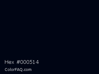 Hex #000514 Color is a almost black blue color and the nearest color is Rich Black FOGRA29 #010b13. Hex code #000514 and RGB value is rgb(0,5,20). In RGB color space, this color is composed of 0% red, 2% green, 8% blue, In CMYK color space, this color is composed of 100% cyan, 75% magenta, 0% yellow , 92% black , In HSL color space, this color has a hue angle of 225° , 100% saturation and 4% lightness.