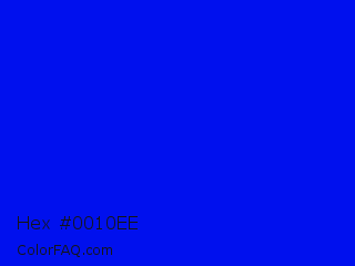 Hex #0010ee Color is a normal blue color and the nearest color is Blue #0000ff. Hex code #0010ee and RGB value is rgb(0,16,238). In RGB color space, this color is composed of 0% red, 6% green, 93% blue, In CMYK color space, this color is composed of 100% cyan, 93% magenta, 0% yellow , 7% black , In HSL color space, this color has a hue angle of 236° , 100% saturation and 47% lightness.