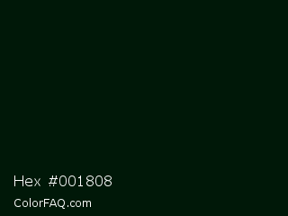 Hex #001808 Color is a almost black green color and the nearest color is Midnight Moss #041004. Hex code #001808 and RGB value is rgb(0,24,8). In RGB color space, this color is composed of 0% red, 9% green, 3% blue, In CMYK color space, this color is composed of 100% cyan, 0% magenta, 67% yellow , 91% black , In HSL color space, this color has a hue angle of 140° , 100% saturation and 5% lightness.