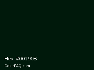 Hex #00190b Color is a almost black green color and the nearest color is Holly #011d13. Hex code #00190b and RGB value is rgb(0,25,11). In RGB color space, this color is composed of 0% red, 10% green, 4% blue, In CMYK color space, this color is composed of 100% cyan, 0% magenta, 56% yellow , 90% black , In HSL color space, this color has a hue angle of 146° , 100% saturation and 5% lightness.