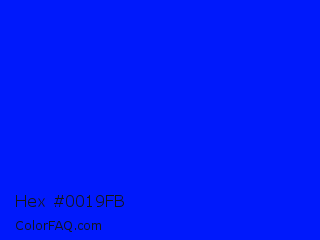 Hex #0019fb Color is a normal blue color and the nearest color is Blue #0000ff. Hex code #0019fb and RGB value is rgb(0,25,251). In RGB color space, this color is composed of 0% red, 10% green, 98% blue, In CMYK color space, this color is composed of 100% cyan, 90% magenta, 0% yellow , 2% black , In HSL color space, this color has a hue angle of 234° , 100% saturation and 49% lightness.