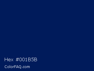 Hex #001b5b Color is a very dark blue color and the nearest color is Gulf Blue #051657. Hex code #001b5b and RGB value is rgb(0,27,91). In RGB color space, this color is composed of 0% red, 11% green, 36% blue, In CMYK color space, this color is composed of 100% cyan, 70% magenta, 0% yellow , 64% black , In HSL color space, this color has a hue angle of 222° , 100% saturation and 18% lightness.