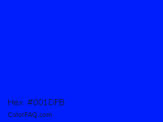 Hex #001dfb Color is a normal blue color and the nearest color is Blue #0000ff. Hex code #001dfb and RGB value is rgb(0,29,251). In RGB color space, this color is composed of 0% red, 11% green, 98% blue, In CMYK color space, this color is composed of 100% cyan, 88% magenta, 0% yellow , 2% black , In HSL color space, this color has a hue angle of 233° , 100% saturation and 49% lightness.