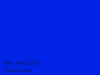 Hex #0023e6 Color is a normal blue color and the nearest color is Bluebonnet #1c1cf0. Hex code #0023e6 and RGB value is rgb(0,35,230). In RGB color space, this color is composed of 0% red, 14% green, 90% blue, In CMYK color space, this color is composed of 100% cyan, 85% magenta, 0% yellow , 10% black , In HSL color space, this color has a hue angle of 231° , 100% saturation and 45% lightness.