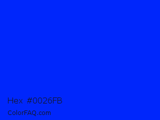 Hex #0026fb Color is a normal blue color and the nearest color is Bluebonnet #1c1cf0. Hex code #0026fb and RGB value is rgb(0,38,251). In RGB color space, this color is composed of 0% red, 15% green, 98% blue, In CMYK color space, this color is composed of 100% cyan, 85% magenta, 0% yellow , 2% black , In HSL color space, this color has a hue angle of 231° , 100% saturation and 49% lightness.