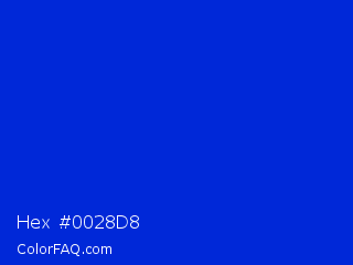Hex #0028d8 Color is a normal blue color and the nearest color is Bluebonnet #1c1cf0. Hex code #0028d8 and RGB value is rgb(0,40,216). In RGB color space, this color is composed of 0% red, 16% green, 85% blue, In CMYK color space, this color is composed of 100% cyan, 81% magenta, 0% yellow , 15% black , In HSL color space, this color has a hue angle of 229° , 100% saturation and 42% lightness.