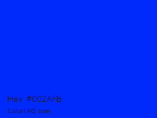 Hex #002afb Color is a normal blue color and the nearest color is Blue RYB #0247fe. Hex code #002afb and RGB value is rgb(0,42,251). In RGB color space, this color is composed of 0% red, 16% green, 98% blue, In CMYK color space, this color is composed of 100% cyan, 83% magenta, 0% yellow , 2% black , In HSL color space, this color has a hue angle of 230° , 100% saturation and 49% lightness.