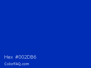 Hex #002db6 Color is a normal blue color and the nearest color is UA Blue #0033aa. Hex code #002db6 and RGB value is rgb(0,45,182). In RGB color space, this color is composed of 0% red, 18% green, 71% blue, In CMYK color space, this color is composed of 100% cyan, 75% magenta, 0% yellow , 29% black , In HSL color space, this color has a hue angle of 225° , 100% saturation and 36% lightness.