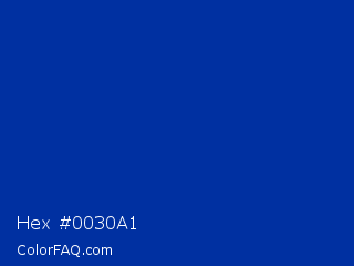 Hex #0030a1 Color is a normal blue color and the nearest color is International Klein Blue #002fa7. Hex code #0030a1 and RGB value is rgb(0,48,161). In RGB color space, this color is composed of 0% red, 19% green, 63% blue, In CMYK color space, this color is composed of 100% cyan, 70% magenta, 0% yellow , 37% black , In HSL color space, this color has a hue angle of 222° , 100% saturation and 32% lightness.