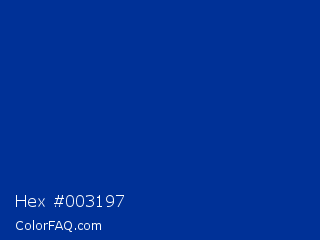 Hex #003197 Color is a dark blue color and the nearest color is Smalt #003399. Hex code #003197 and RGB value is rgb(0,49,151). In RGB color space, this color is composed of 0% red, 19% green, 59% blue, In CMYK color space, this color is composed of 100% cyan, 68% magenta, 0% yellow , 41% black , In HSL color space, this color has a hue angle of 221° , 100% saturation and 30% lightness.