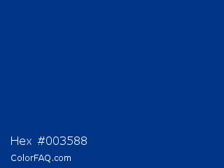 Hex #003588 Color is a dark blue color and the nearest color is Air Force Blue USAF #00308f. Hex code #003588 and RGB value is rgb(0,53,136). In RGB color space, this color is composed of 0% red, 21% green, 53% blue, In CMYK color space, this color is composed of 100% cyan, 61% magenta, 0% yellow , 47% black , In HSL color space, this color has a hue angle of 217° , 100% saturation and 27% lightness.