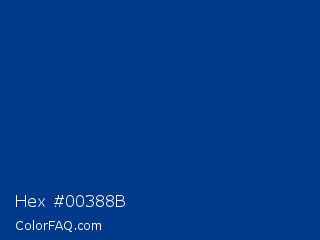 Hex #00388b Color is a dark blue color and the nearest color is Air Force Blue USAF #00308f. Hex code #00388b and RGB value is rgb(0,56,139). In RGB color space, this color is composed of 0% red, 22% green, 55% blue, In CMYK color space, this color is composed of 100% cyan, 60% magenta, 0% yellow , 45% black , In HSL color space, this color has a hue angle of 216° , 100% saturation and 27% lightness.