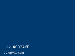 Hex #003a6e Color is a very dark blue color and the nearest color is Regal Blue #013f6a. Hex code #003a6e and RGB value is rgb(0,58,110). In RGB color space, this color is composed of 0% red, 23% green, 43% blue, In CMYK color space, this color is composed of 100% cyan, 47% magenta, 0% yellow , 57% black , In HSL color space, this color has a hue angle of 208° , 100% saturation and 22% lightness.