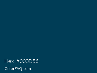Hex #003d56 Color is a very dark blue color and the nearest color is Teal Blue #044259. Hex code #003d56 and RGB value is rgb(0,61,86). In RGB color space, this color is composed of 0% red, 24% green, 34% blue, In CMYK color space, this color is composed of 100% cyan, 29% magenta, 0% yellow , 66% black , In HSL color space, this color has a hue angle of 197° , 100% saturation and 17% lightness.