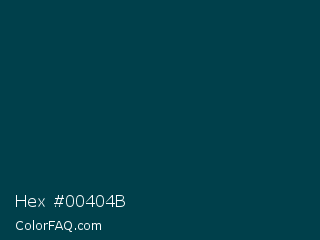 Hex #00404b Color is a very dark cyan color and the nearest color is Warm Black #004242. Hex code #00404b and RGB value is rgb(0,64,75). In RGB color space, this color is composed of 0% red, 25% green, 29% blue, In CMYK color space, this color is composed of 100% cyan, 15% magenta, 0% yellow , 71% black , In HSL color space, this color has a hue angle of 189° , 100% saturation and 15% lightness.