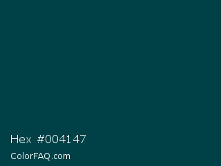 Hex #004147 Color is a very dark cyan color and the nearest color is Warm Black #004242. Hex code #004147 and RGB value is rgb(0,65,71). In RGB color space, this color is composed of 0% red, 25% green, 28% blue, In CMYK color space, this color is composed of 100% cyan, 8% magenta, 0% yellow , 72% black , In HSL color space, this color has a hue angle of 185° , 100% saturation and 14% lightness.