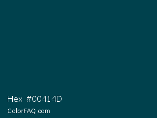 Hex #00414d Color is a very dark cyan color and the nearest color is Sherpa Blue #004950. Hex code #00414d and RGB value is rgb(0,65,77). In RGB color space, this color is composed of 0% red, 25% green, 30% blue, In CMYK color space, this color is composed of 100% cyan, 16% magenta, 0% yellow , 70% black , In HSL color space, this color has a hue angle of 189° , 100% saturation and 15% lightness.