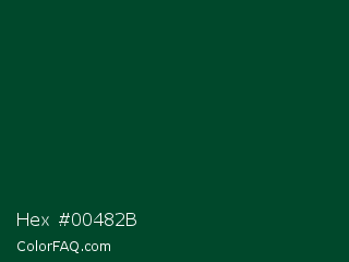 Hex #00482b Color is a very dark green color and the nearest color is Sherwood Green #02402c. Hex code #00482b and RGB value is rgb(0,72,43). In RGB color space, this color is composed of 0% red, 28% green, 17% blue, In CMYK color space, this color is composed of 100% cyan, 0% magenta, 40% yellow , 72% black , In HSL color space, this color has a hue angle of 156° , 100% saturation and 14% lightness.