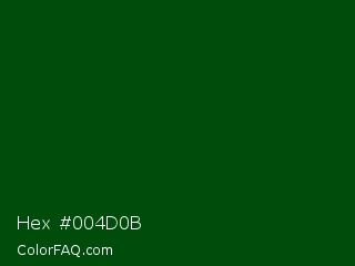 Hex #004d0b Color is a very dark green color and the nearest color is Dark Fern #0a480d. Hex code #004d0b and RGB value is rgb(0,77,11). In RGB color space, this color is composed of 0% red, 30% green, 4% blue, In CMYK color space, this color is composed of 100% cyan, 0% magenta, 86% yellow , 70% black , In HSL color space, this color has a hue angle of 129° , 100% saturation and 15% lightness.