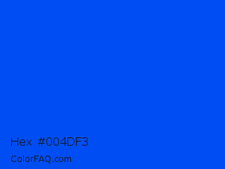 Hex #004df3 Color is a normal blue color and the nearest color is Blue RYB #0247fe. Hex code #004df3 and RGB value is rgb(0,77,243). In RGB color space, this color is composed of 0% red, 30% green, 95% blue, In CMYK color space, this color is composed of 100% cyan, 68% magenta, 0% yellow , 5% black , In HSL color space, this color has a hue angle of 221° , 100% saturation and 48% lightness.
