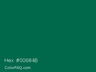 Hex #00684b Color is a very dark green color and the nearest color is Bottle Green #006a4e. Hex code #00684b and RGB value is rgb(0,104,75). In RGB color space, this color is composed of 0% red, 41% green, 29% blue, In CMYK color space, this color is composed of 100% cyan, 0% magenta, 28% yellow , 59% black , In HSL color space, this color has a hue angle of 163° , 100% saturation and 20% lightness.