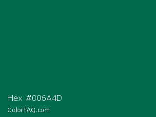 Hex #006a4d Color is a very dark cyan color and the nearest color is Bottle Green #006a4e. Hex code #006a4d and RGB value is rgb(0,106,77). In RGB color space, this color is composed of 0% red, 42% green, 30% blue, In CMYK color space, this color is composed of 100% cyan, 0% magenta, 27% yellow , 58% black , In HSL color space, this color has a hue angle of 164° , 100% saturation and 21% lightness.