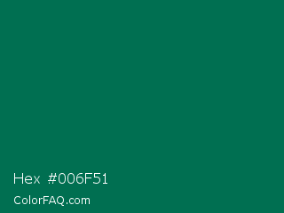 Hex #006f51 Color is a very dark cyan color and the nearest color is Bottle Green #006a4e. Hex code #006f51 and RGB value is rgb(0,111,81). In RGB color space, this color is composed of 0% red, 44% green, 32% blue, In CMYK color space, this color is composed of 100% cyan, 0% magenta, 27% yellow , 56% black , In HSL color space, this color has a hue angle of 164° , 100% saturation and 22% lightness.