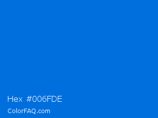 Hex #006fde Color is a normal blue color and the nearest color is True Blue #0073cf. Hex code #006fde and RGB value is rgb(0,111,222). In RGB color space, this color is composed of 0% red, 44% green, 87% blue, In CMYK color space, this color is composed of 100% cyan, 50% magenta, 0% yellow , 13% black , In HSL color space, this color has a hue angle of 210° , 100% saturation and 44% lightness.