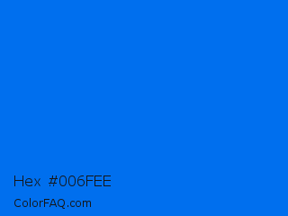 Hex #006fee Color is a normal blue color and the nearest color is Brandeis Blue #0070ff. Hex code #006fee and RGB value is rgb(0,111,238). In RGB color space, this color is composed of 0% red, 44% green, 93% blue, In CMYK color space, this color is composed of 100% cyan, 53% magenta, 0% yellow , 7% black , In HSL color space, this color has a hue angle of 212° , 100% saturation and 47% lightness.