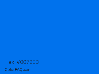 Hex #0072ed Color is a normal blue color and the nearest color is Brandeis Blue #0070ff. Hex code #0072ed and RGB value is rgb(0,114,237). In RGB color space, this color is composed of 0% red, 45% green, 93% blue, In CMYK color space, this color is composed of 100% cyan, 52% magenta, 0% yellow , 7% black , In HSL color space, this color has a hue angle of 211° , 100% saturation and 46% lightness.