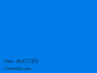 Hex #007ce8 Color is a normal blue color and the nearest color is Azure Radiance #007fff. Hex code #007ce8 and RGB value is rgb(0,124,232). In RGB color space, this color is composed of 0% red, 49% green, 91% blue, In CMYK color space, this color is composed of 100% cyan, 47% magenta, 0% yellow , 9% black , In HSL color space, this color has a hue angle of 208° , 100% saturation and 45% lightness.