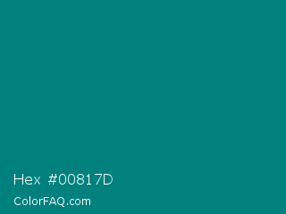 Hex #00817d Color is a dark cyan color and the nearest color is Teal Green #00827f. Hex code #00817d and RGB value is rgb(0,129,125). In RGB color space, this color is composed of 0% red, 51% green, 49% blue, In CMYK color space, this color is composed of 100% cyan, 0% magenta, 3% yellow , 49% black , In HSL color space, this color has a hue angle of 178° , 100% saturation and 25% lightness.