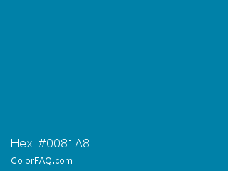 Hex #0081a8 Color is a normal blue color and the nearest color is Deep Cerulean #007ba7. Hex code #0081a8 and RGB value is rgb(0,129,168). In RGB color space, this color is composed of 0% red, 51% green, 66% blue, In CMYK color space, this color is composed of 100% cyan, 23% magenta, 0% yellow , 34% black , In HSL color space, this color has a hue angle of 194° , 100% saturation and 33% lightness.