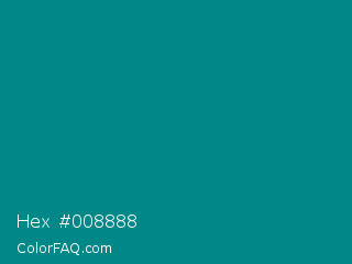 Hex #008888 Color is a dark cyan color and the nearest color is Dark Cyan #008b8b. Hex code #008888 and RGB value is rgb(0,136,136). In RGB color space, this color is composed of 0% red, 53% green, 53% blue, In CMYK color space, this color is composed of 100% cyan, 0% magenta, 0% yellow , 47% black , In HSL color space, this color has a hue angle of 180° , 100% saturation and 27% lightness.