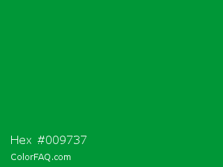 Hex #009737 Color is a dark green color and the nearest color is North Texas Green #059033. Hex code #009737 and RGB value is rgb(0,151,55). In RGB color space, this color is composed of 0% red, 59% green, 22% blue, In CMYK color space, this color is composed of 100% cyan, 0% magenta, 64% yellow , 41% black , In HSL color space, this color has a hue angle of 142° , 100% saturation and 30% lightness.