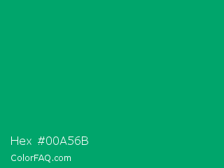 Hex #00a56b Color is a normal green color and the nearest color is Jade #00a86b. Hex code #00a56b and RGB value is rgb(0,165,107). In RGB color space, this color is composed of 0% red, 65% green, 42% blue, In CMYK color space, this color is composed of 100% cyan, 0% magenta, 35% yellow , 35% black , In HSL color space, this color has a hue angle of 159° , 100% saturation and 32% lightness.