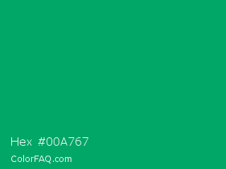Hex #00a767 Color is a normal green color and the nearest color is Jade #00a86b. Hex code #00a767 and RGB value is rgb(0,167,103). In RGB color space, this color is composed of 0% red, 65% green, 40% blue, In CMYK color space, this color is composed of 100% cyan, 0% magenta, 38% yellow , 35% black , In HSL color space, this color has a hue angle of 157° , 100% saturation and 33% lightness.