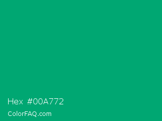 Hex #00a772 Color is a normal green color and the nearest color is Green Munsell #00a877. Hex code #00a772 and RGB value is rgb(0,167,114). In RGB color space, this color is composed of 0% red, 65% green, 45% blue, In CMYK color space, this color is composed of 100% cyan, 0% magenta, 32% yellow , 35% black , In HSL color space, this color has a hue angle of 161° , 100% saturation and 33% lightness.