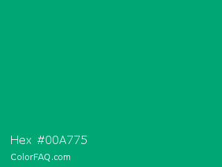 Hex #00a775 Color is a normal green color and the nearest color is Green Munsell #00a877. Hex code #00a775 and RGB value is rgb(0,167,117). In RGB color space, this color is composed of 0% red, 65% green, 46% blue, In CMYK color space, this color is composed of 100% cyan, 0% magenta, 30% yellow , 35% black , In HSL color space, this color has a hue angle of 162° , 100% saturation and 33% lightness.