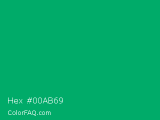 Hex #00ab69 Color is a normal green color and the nearest color is GO Green #00ab66. Hex code #00ab69 and RGB value is rgb(0,171,105). In RGB color space, this color is composed of 0% red, 67% green, 41% blue, In CMYK color space, this color is composed of 100% cyan, 0% magenta, 39% yellow , 33% black , In HSL color space, this color has a hue angle of 157° , 100% saturation and 34% lightness.