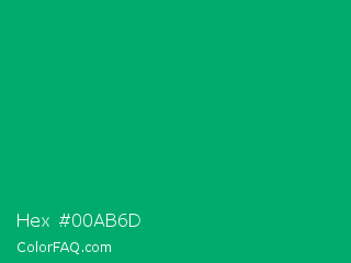 Hex #00ab6d Color is a normal green color and the nearest color is Jade #00a86b. Hex code #00ab6d and RGB value is rgb(0,171,109). In RGB color space, this color is composed of 0% red, 67% green, 43% blue, In CMYK color space, this color is composed of 100% cyan, 0% magenta, 36% yellow , 33% black , In HSL color space, this color has a hue angle of 158° , 100% saturation and 34% lightness.