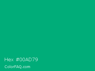Hex #00ad79 Color is a normal green color and the nearest color is Green Munsell #00a877. Hex code #00ad79 and RGB value is rgb(0,173,121). In RGB color space, this color is composed of 0% red, 68% green, 47% blue, In CMYK color space, this color is composed of 100% cyan, 0% magenta, 30% yellow , 32% black , In HSL color space, this color has a hue angle of 162° , 100% saturation and 34% lightness.