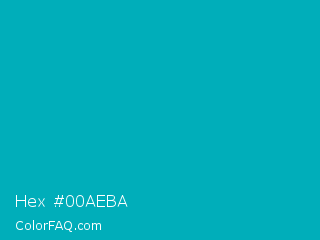 Hex #00aeba Color is a normal cyan color and the nearest color is Tiffany Blue #0abab5. Hex code #00aeba and RGB value is rgb(0,174,186). In RGB color space, this color is composed of 0% red, 68% green, 73% blue, In CMYK color space, this color is composed of 100% cyan, 6% magenta, 0% yellow , 27% black , In HSL color space, this color has a hue angle of 184° , 100% saturation and 36% lightness.