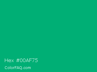Hex #00af75 Color is a normal green color and the nearest color is Green Munsell #00a877. Hex code #00af75 and RGB value is rgb(0,175,117). In RGB color space, this color is composed of 0% red, 69% green, 46% blue, In CMYK color space, this color is composed of 100% cyan, 0% magenta, 33% yellow , 31% black , In HSL color space, this color has a hue angle of 160° , 100% saturation and 34% lightness.