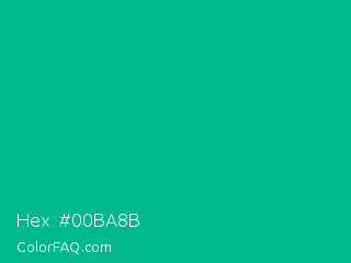 Hex #00ba8b Color is a normal cyan color and the nearest color is Persian Green #00a693. Hex code #00ba8b and RGB value is rgb(0,186,139). In RGB color space, this color is composed of 0% red, 73% green, 55% blue, In CMYK color space, this color is composed of 100% cyan, 0% magenta, 25% yellow , 27% black , In HSL color space, this color has a hue angle of 165° , 100% saturation and 36% lightness.
