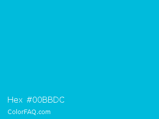 Hex #00bbdc Color is a normal cyan color and the nearest color is Cyan Process #00b7eb. Hex code #00bbdc and RGB value is rgb(0,187,220). In RGB color space, this color is composed of 0% red, 73% green, 86% blue, In CMYK color space, this color is composed of 100% cyan, 15% magenta, 0% yellow , 14% black , In HSL color space, this color has a hue angle of 189° , 100% saturation and 43% lightness.