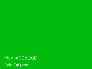 Hex #00bd0d Color is a normal green color and the nearest color is Vivid Malachite #00cc33. Hex code #00bd0d and RGB value is rgb(0,189,13). In RGB color space, this color is composed of 0% red, 74% green, 5% blue, In CMYK color space, this color is composed of 100% cyan, 0% magenta, 93% yellow , 26% black , In HSL color space, this color has a hue angle of 124° , 100% saturation and 37% lightness.