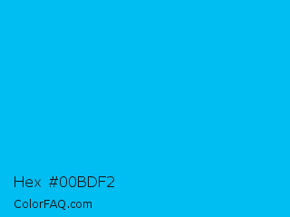 Hex #00bdf2 Color is a normal cyan color and the nearest color is Cyan Process #00b7eb. Hex code #00bdf2 and RGB value is rgb(0,189,242). In RGB color space, this color is composed of 0% red, 74% green, 95% blue, In CMYK color space, this color is composed of 100% cyan, 22% magenta, 0% yellow , 5% black , In HSL color space, this color has a hue angle of 193° , 100% saturation and 47% lightness.